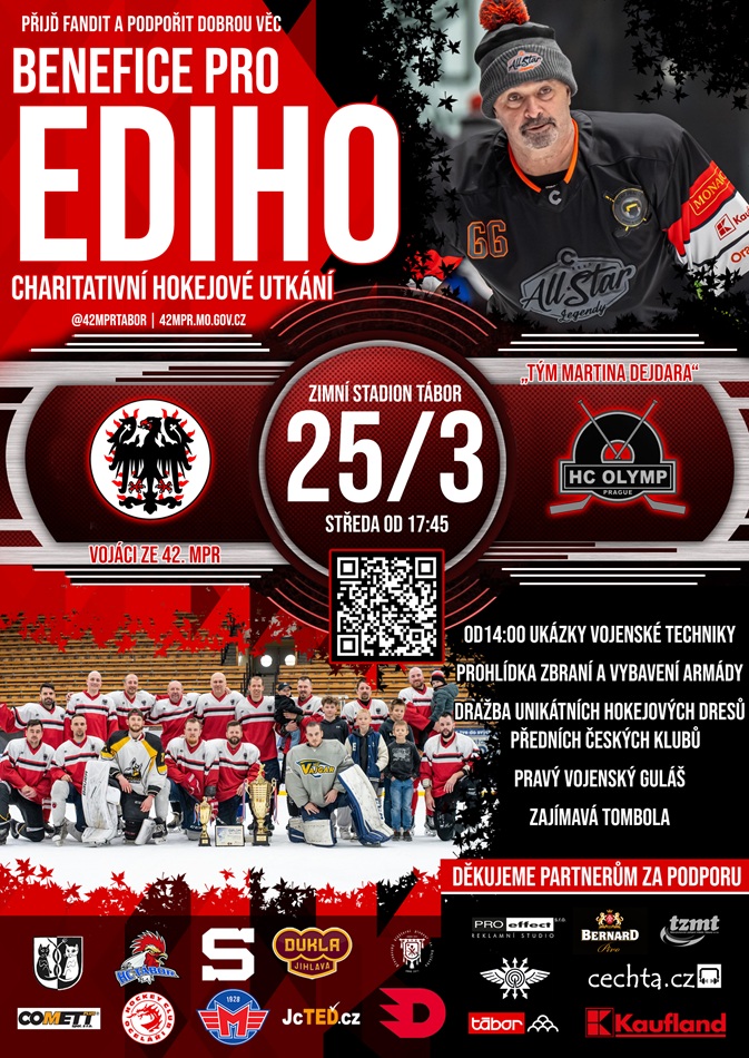 Po dvouleté pauze se dne 25. března 2026 v Táboře na ledě znovu potkají příslušníci Armády České republiky a tým HC Olymp Martina Dejdara. Atraktivní hokejové utkání nabídne nejen sportovní zážitek a jedinečné setkání vojáků s představiteli českého showbyznysu, ale především ponese silný charitativní rozměr.