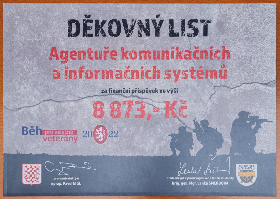 Dne 21.9. obdrželi příslušníci Agentury KIS od předsedkyně výboru Vojenského fondu solidarity brig. gen. Mgr. Lenky Šmerdové děkovný list za finanční podporu fondu v rámci Běhu pro válečné veterány okolo republiky. Děkovný list převzali vrchní praporčíci Agentury KIS, štábní praporčík Bohumil Honek a praporčice Iveta Dušková a také zástupce běžců kapitán Lukáš Krajíček.