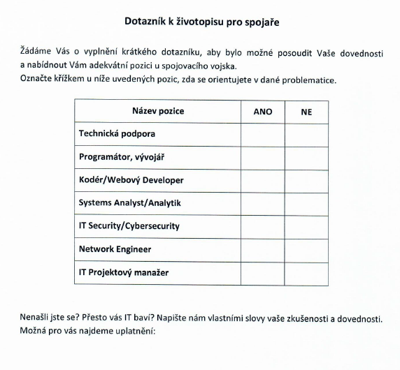 Baví vás armáda, ale zároveň také nové technologie a měli byste zájem spolužit u spojovacího vojska? Nevíte jak na to? A přitom je to tak jednoduché. U vašeho prvního pohovoru na rekrutačním středisku stačí nahlásit, že byste měli zájem sloužit u spojovacího vojska, případně že reagujete na kampaň Spojař Nové Generace. Již v této chvíli byste měli obdržet tuto přílohu (viz níže). A jak jí chápat? Armáda ČR a spojovací vojsko provozuje celou řadu technologií a zařízení, které jsou zcela unikátní. Je nám tedy jasné, že si vás v dané oblasti budeme muset zaškolit. Nicméně vše má nějaký svůj základ a my bychom rádi věděli, že to spolu zvládneme. Proto prosím věnujte pozornost vysvětlení jednotlivých položek, byť si myslíme, že kdo se v dané oblasti pohybuje, vyplnění je pro něho hračka.
